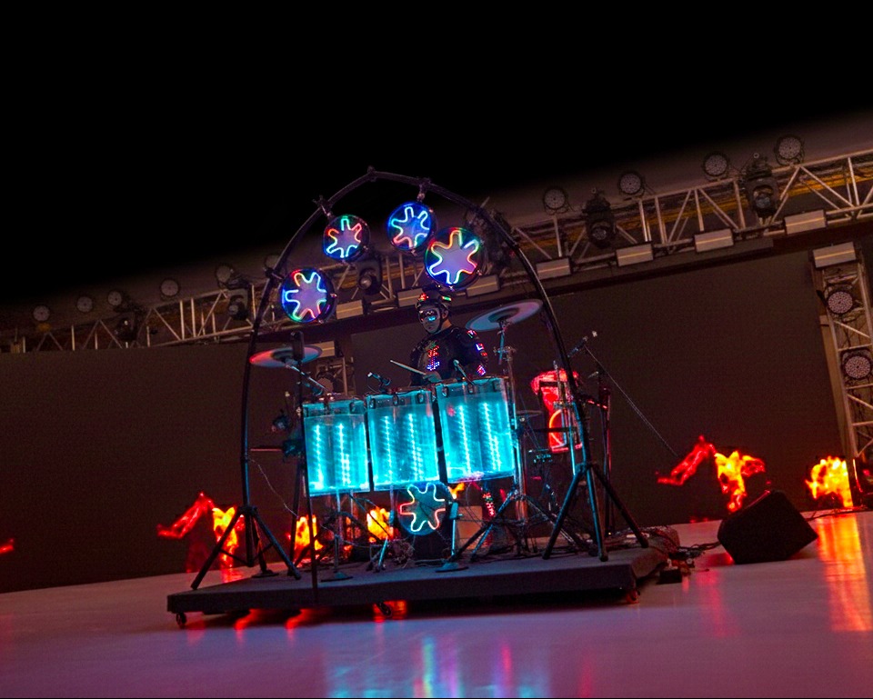 A robotic drummer lit with vibrant LEDs, creating a dynamic fusion of rhythm and visual magic.